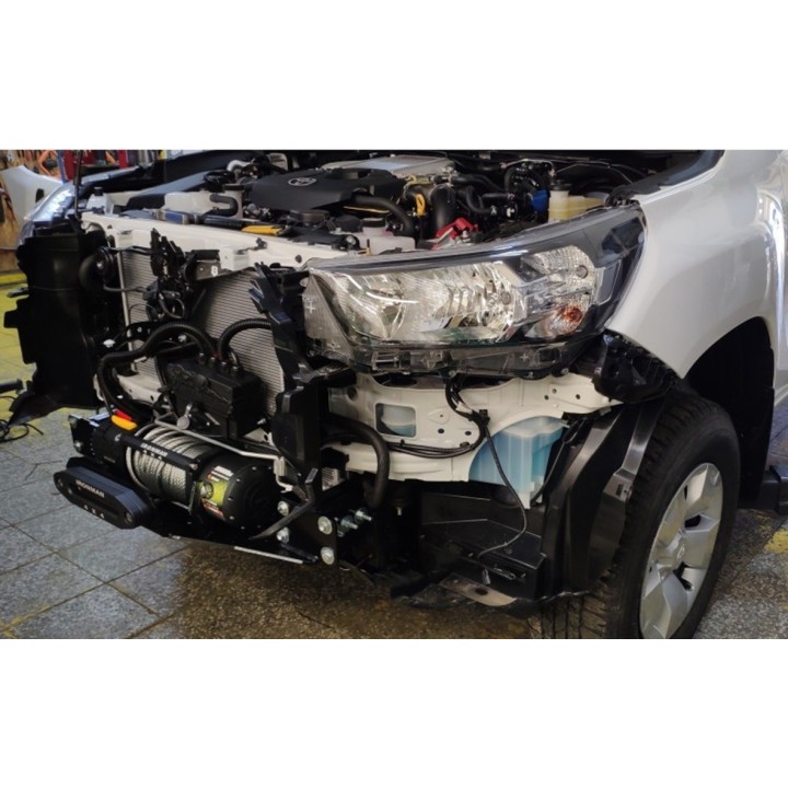 Toyota Hilux SR5 2021 - placa de montaje de cabrestante oculta de hasta 6000 kgs debajo del parachoques original. La instalación no requiere soldadura ni perforación. Se atornilla en los orificios de fábrica del chasis. Se puede instalar un cabrestante con una altura no superior a 170 mm. Fabricado en chapa de acero estructural de 6 mm de espesor. Granallado y recubrimiento en polvo con tecnología texturizada de doble capa. Peso aprox. 14,2 kg.