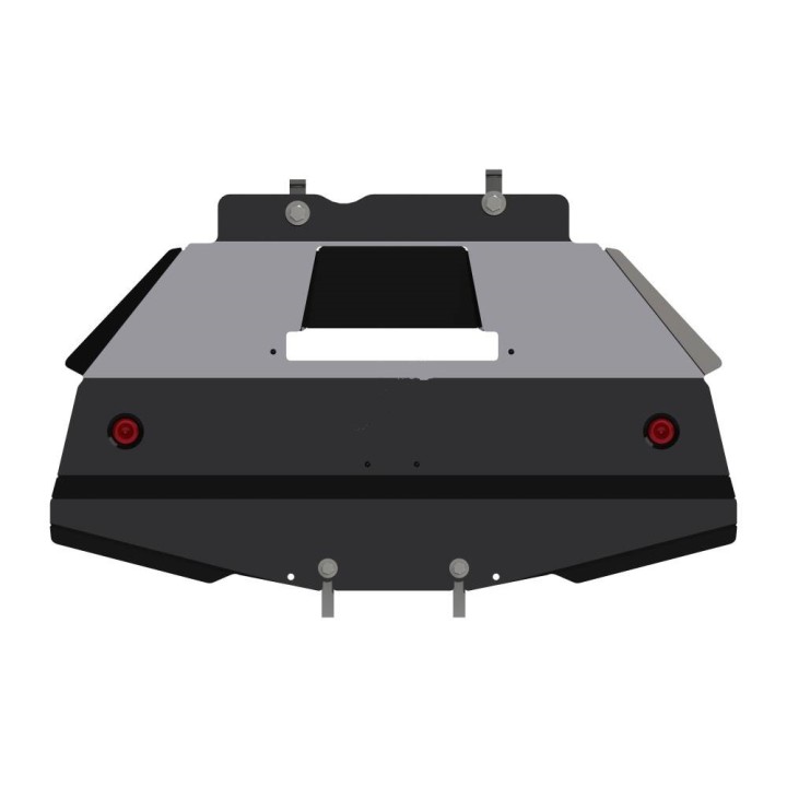 Esta placa protectora es de acero de calidad de 3 mm de espesor y se fija a los orificios originales del vehículo. Las aberturas de servicio en la placa protectora permiten el mantenimiento del vehículo sin desmontaje.
