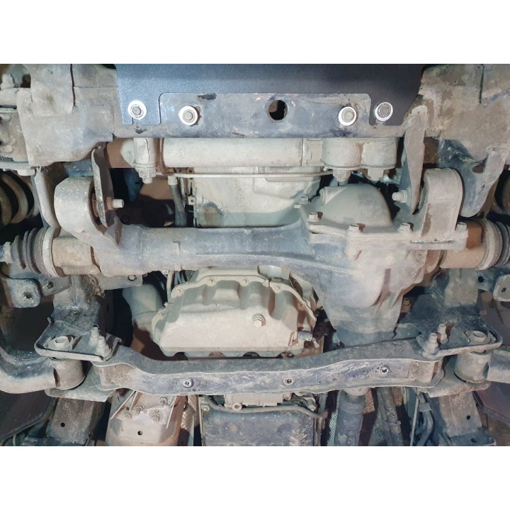 Esta placa de protección es de acero de calidad de 3 mm de espesor y se fija a los orificios originales del vehículo. Las aberturas de servicio en la placa de protección permiten el mantenimiento del vehículo sin desmontaje.
