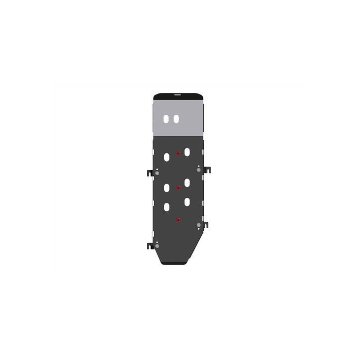 Esta placa de protección es de acero de calidad de 3 mm de espesor y se fija a los orificios originales del vehículo. Las aberturas de servicio en la placa de protección permiten el mantenimiento del vehículo sin desmontaje.