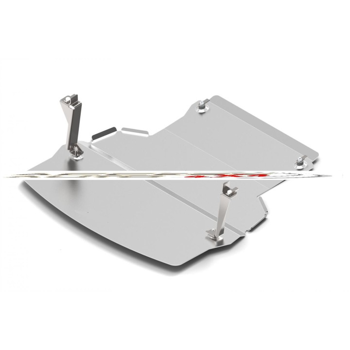 Esta placa de protección es de aluminio de calidad de 5 mm de espesor y se fija a los orificios originales del vehículo. Las aberturas de servicio en la placa de protección permiten el mantenimiento del vehículo sin desmontaje.