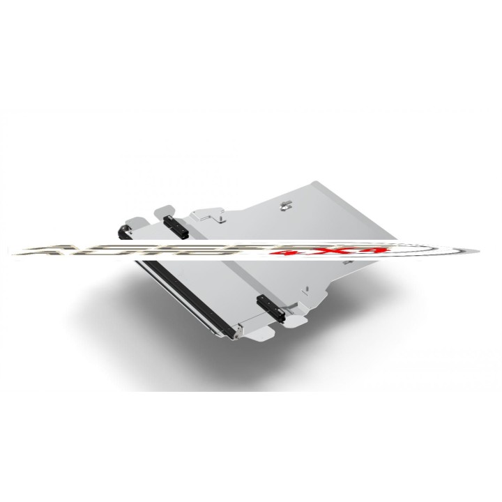 Esta placa de protección es de aluminio de calidad de 5 mm de espesor y se fija a los orificios originales del vehículo. Las aberturas de servicio en la placa de protección permiten el mantenimiento del vehículo sin desmontaje.