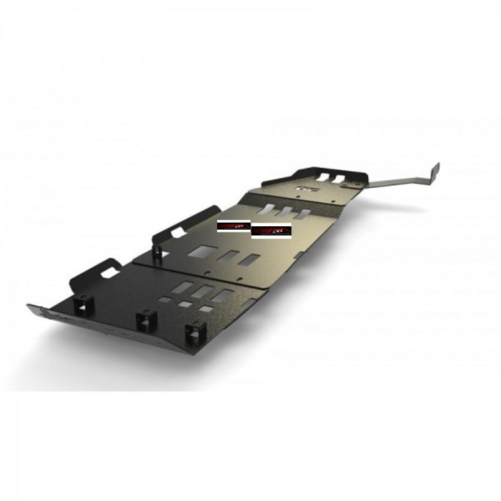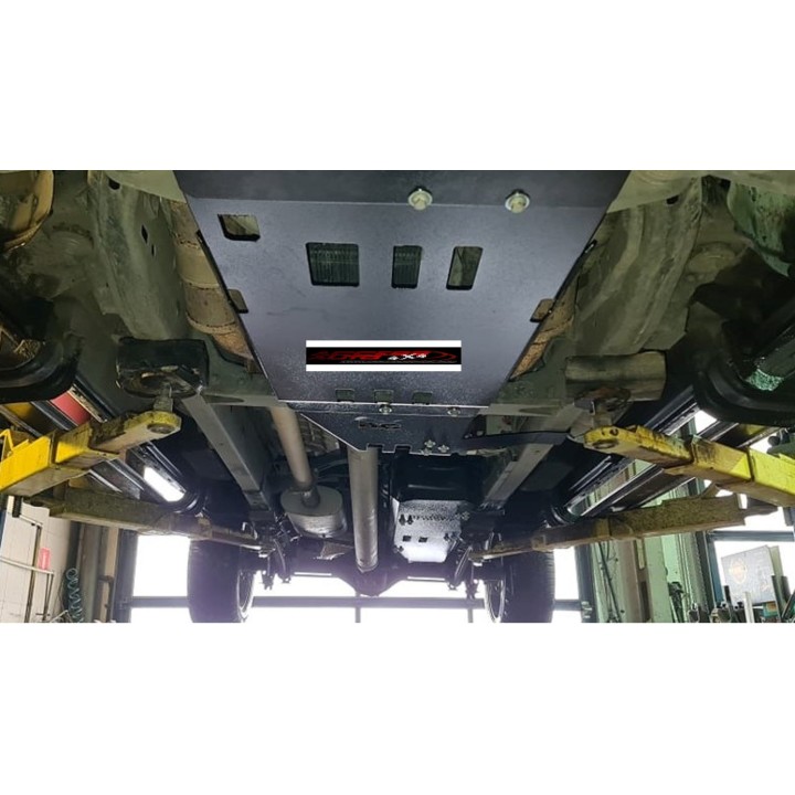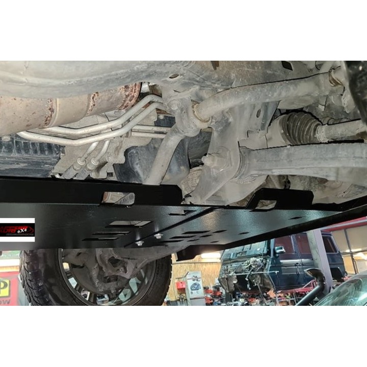 Estas placas de protección son de acero de calidad de 4 mm de espesor y se fijan a los orificios originales del vehículo. Las aberturas de servicio en la placa de protección permiten el mantenimiento del vehículo sin desmontaje.