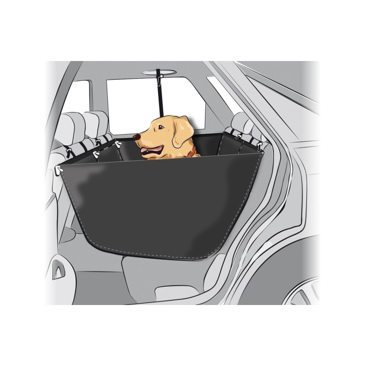 Cubre y protege los asientos, los respaldos traseros y el compartimento trasero del suelo. Extiende la superficie y el espacio disponible para el animal, evitando que se caiga del asiento.