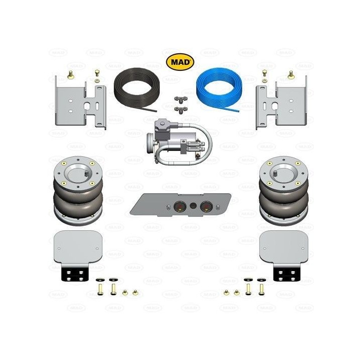La suspensión neumática MAD está generalmente diseñada para funcionar como complemento de la suspensión trasera original del vehículo. Disponible en diferentes versiones, es adecuada para automovilistas que desean ajustar la firmeza de su suspensión. Es posible el inflado manual, que requiere acceso a aire comprimido para inflar los fuelles a la presión deseada. También está disponible una versión con compresor y manómetro, que permite un ajuste preciso de la presión, incluso mientras se conduce. Finalmente, una suspensión neumática integral compensa la suspensión original y ajusta automáticamente el nivel de carga. La instalación de una suspensión neumática transforma radicalmente la experiencia de conducción, ya sea que el vehículo esté cargado o no. Cada suspensión está diseñada específicamente para adaptarse a su modelo de coche. También permite ajustar la altura de la parte trasera del vehículo, especialmente para una mayor distancia al suelo. Con la suspensión neumática MAD, el confort y la seguridad alcanzan un nivel completamente nuevo. Su instalación no requiere ninguna modificación del vehículo ni perforación para la fijación de los soportes de los fuelles. Los kits MAD nunca afectan la garantía del vehículo.