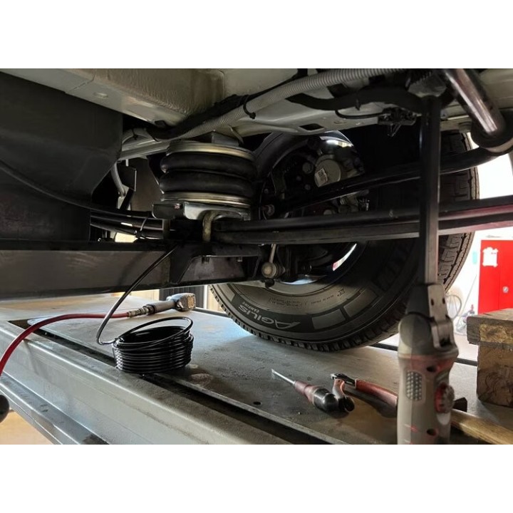 Este kit de suspensión neumática particular con compresor y manómetro es increíblemente eficaz si posee una furgoneta, una autocaravana "Plåtis" o una autocaravana para la que desea la mejor suspensión neumática del mercado. Las autocaravanas ya están construidas de forma pesada desde el principio y necesitan reforzar su suspensión trasera. Una furgoneta camper o una autocaravana serán mucho mejores con los fuelles neumáticos MAD en la parte trasera.