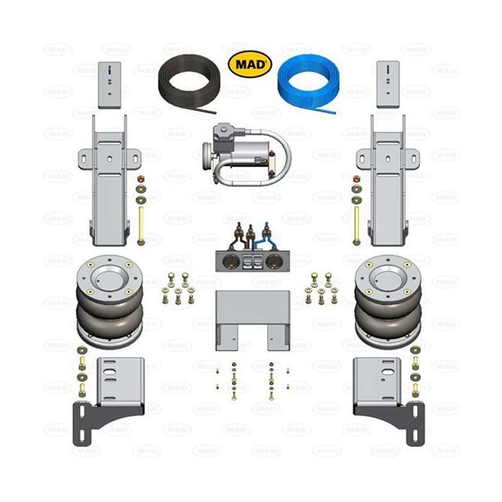 El kit de suspensión neumática auxiliar MAD se presenta en forma de dos cojines de aire suministrados con todas las piezas necesarias adaptadas a cada tipo de chasis :